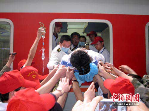 隨后,在“小心!小心!平移!平移!”的聲音中,鐵路人和醫務人員將病人放上擔架,并輕輕從窗口遞出,窗外每輛擔架車兩邊分別等候著的5名志愿者和4名醫護人員,也是格外小心的輕舉著從窗口傳出的傷員。