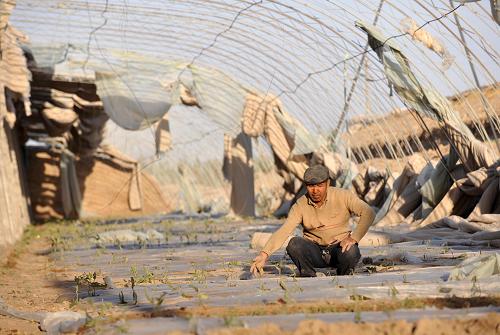 記者在恰特喀勒鄉設施農業基地看到,大棚遭到大風不同程度的毀壞,棚頂的塑料薄膜全部被大風吹爛,大棚內的西紅柿、茄子等蔬菜被風沙侵襲后干枯,一些已經掛果的蔬菜也大面積枯死。