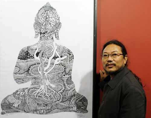 很晚了,我們才坐到飯桌旁,吾要這些天為悼念遇難同胞吃素,不事煙酒,只是溫和地說(shuō)話。他說(shuō)世人對(duì)佛的理解有偏頗,以為佛無(wú)所不能、護(hù)佑眾生,而他認(rèn)為佛的精義在于教人向善、慈悲、寬容。畫(huà)展陳列作品的主角是佛陀,是圣山,圣水,圣靈,這些不是神,是心,是偉大的自然之子——人的本身,是人類尊重生命、善待眾生、敬畏自然、愛(ài)護(hù)環(huán)境的藝術(shù)再現(xiàn)和哲理升華。