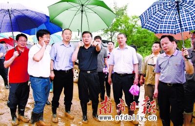 汪洋和省委常委、秘書長徐少華一到韶關,就在韶關市委書記徐建華、市長鄭振濤等陪同下,趕到災情最為嚴重的翁源縣翁城區富陂村。