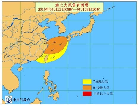中新網5月22日電 中央氣象臺5月22日6時發布海上大風黃色預警:受入海氣旋影響,22日08到23日20時,東海大部海域將有9級大風,陣風可達10~11級。