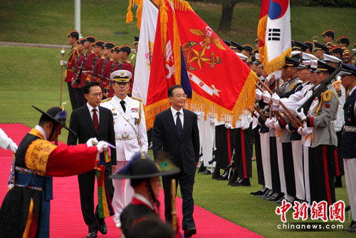 中新網首爾5月28日電 (記者 周兆軍)中國總理溫家寶28日在首爾同韓國總統李明博會談。雙方就朝鮮半島局勢坦誠、深入交換了看法。