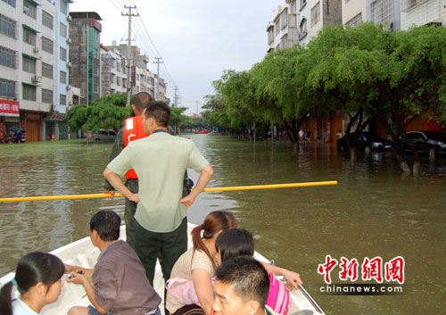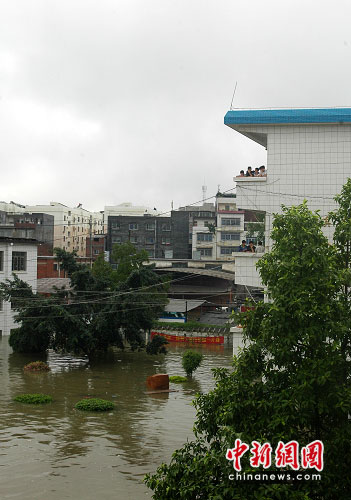 記者在來賓市實驗中學看到,該校已成為一片湖泊。水深處約有1.6米,已經淹過成年男子肩膀。水中七零八落飄散著住戶的生活用品,一樓居民已經全部撤離。消防官兵自早上8時許開始對被困師生進行救援,直至下午5時,該校1100名被困師生及家屬全部撤至安全地帶。學校內停電并且無法出行,影響了不少居民的正常生活。周邊幾家商鋪圍擋自家門口防止積水流進店內,用各種器皿向外倒水。