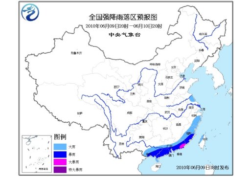 預(yù)計,6月9日20時到6月10日20時,江蘇東部、浙江南部、福建大部、廣東大部、廣西中南部、臺灣西北部等地有大雨,其中,福建南部、廣東中南部、廣西東南部等地有暴雨,局部有大暴雨;上述部分地區(qū)還將伴有短時雷雨大風等強對流天氣。