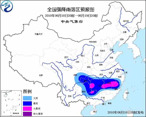 預(yù)計(jì),6月18日20時(shí)到6月19日20時(shí),四川盆地大部、重慶大部、貴州中東部、湖北南部、湖南大部、江西大部、浙江南部、福建中北部、廣西北部等地有大到暴雨,其中,湖南中部、江西中部、福建西北部、廣西東北部等地的部分地區(qū)有大暴雨;上述部分地區(qū)并伴有短時(shí)雷雨大風(fēng)等強(qiáng)對(duì)流天氣。