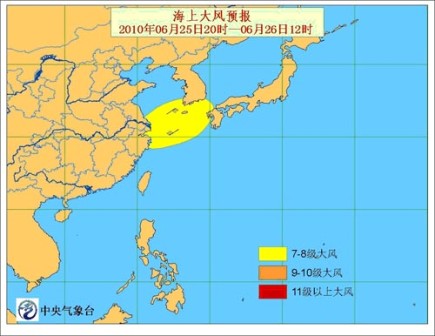 預計,25日20時至26日20時,受入海氣旋影響,黃海南部海域、東海北部海域將有7~8級、陣風9級的大風;東海南部海域、臺灣海峽、臺灣以東洋面將有6~7級、陣風8級的西南風;黃海中部海域將有5~6級東北風。黃海南部海域、東海北部海域的能見度不足10公里。其他海域天氣海況條件較好。
