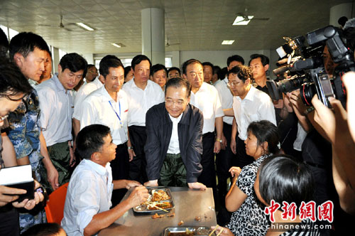 溫家寶總理十分惦記受災(zāi)群眾的吃飯問題。他走進(jìn)食堂時(shí),數(shù)百位受災(zāi)群眾正在吃晚飯。總理與正在吃飯的鄉(xiāng)親們拉起家常,“你們是一家人嗎?吃的怎么樣?”鄉(xiāng)親說:“我們有一家人在,在學(xué)校食堂吃得很好,有葷有素,比自己家還要豐盛些。感謝黨和政府,感謝總理!”看了大家吃得很香,總理才放心地離開食堂。