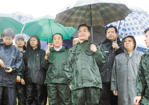 6月24日,中共中央政治局常委、國務(wù)院總理溫家寶不辭辛勞,在江西防汛抗洪處于最緊要的關(guān)頭,再次來到江西。一下飛機(jī),總理在省委書記蘇榮、省長吳新雄等陪同下,直奔險(xiǎn)情、災(zāi)情最重的撫州,冒雨察看汛情、災(zāi)情,代表黨中央、國務(wù)院、中央軍委和胡錦濤總書記看望受災(zāi)群眾,慰問奮戰(zhàn)在抗洪搶險(xiǎn)一線的解放軍、武警、公安民警和消防官兵,指導(dǎo)抗洪救災(zāi)工作。
