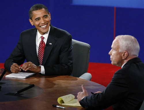 美國共和黨總統候選人麥凱恩和民主黨總統候選人奧巴馬于美東時間15日晚上9時(北京時間16日早上9時)在紐約霍夫斯特拉大學展開總統選舉投票前的最后一場電視辯論。雙方坐在同一張桌子前就各自的經濟計劃展開唇槍舌戰。