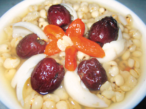 取薏仁米50g、百合15g、粳米100g、蜂蜜適量。將薏仁米、百合、粳米入鍋加水煮至熟爛,入蜂蜜調勻,出鍋即成。分2次服完。此粥有健脾益胃,澤膚祛斑功效。可用于治療婦女面部雀斑、痤瘡、濕疹等癥,對癰腫、濕瘡有治療效果。