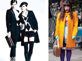 拋開丑女貝蒂的身材不說,這件橙色大衣搭配紫色絲襪還是挺不錯的,對比色運(yùn)用得很到位,圓頭淑女鞋搭配得也無懈可擊。