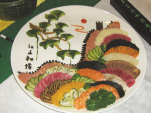 以色命名:金玉羹、玉露團、琥珀肉。以時令命名:冬凌粥、秋葉餅。以烹調(diào)技法命名:滑熘里脊、粉蒸肉、干炸帶魚。以地名命名:北京烤鴨、南京板鴨、涪陵榨菜。以人物命名:東坡肉、文思豆腐、宮爆雞丁。以典故命名:柳浪聞鶯、掌上明珠、陽關(guān)三疊。以比喻、寄意、抒懷命名:通神餅、龍鳳腿、龍眼包子、麒麟魚、鴛鴦魚片、螞蟻上樹。以數(shù)字命名:一窩絲、二色膾、三不粘、四美羹、五福餅、六一菜、七返糕、八寶飯、九絲湯、十遠(yuǎn)羹、酒醉十三蠔、二十四氣餛飩、五彩牛百葉、八寶三味梨、百鳥歸鳳、千層糕、萬年紫鮑。