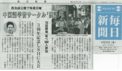 中新網(wǎng)8月11日電 日本僑報社創(chuàng)辦的星期日漢語角于8月8日在東京迎來了三周年紀念大會。此前的8月5日,1872年創(chuàng)刊、日本歷史最悠久的報紙《每日新聞》圖文并茂地報道了漢語角。漢語角創(chuàng)辦三年來,受到日本主流社會越來越多的關(guān)注。