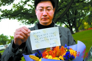 陳先生還特意買了兩束鮮花,其中一束粉紅色的玫瑰是他補送的情人節鮮花,他在寫給妻子的留言中說:“這次你要永遠留著,不要再扔垃圾桶了!