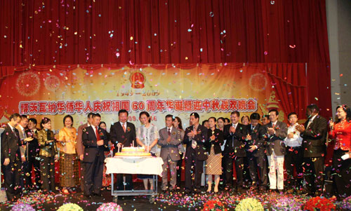 中新網9月20日電 據非洲《華僑周報》報道,16日,中國駐博茨瓦納大使館與旅博僑團在首都哈博羅內聯合舉行慶祝中國成立60周年暨迎中秋晚會。駐博大使劉煥興、經商參贊宮和平、博茨瓦納中國和平統一促進會會長喬良、博茨瓦納華商總會會長劉冰、博茨瓦納-中國友好協會執行主席南庚戌以及福建同鄉會、江西同鄉會、馬翁僑社、中資企業協會等組織及僑胞代表共300余人歡聚一堂,共慶偉大祖國60周年華誕,共迎中秋傳統佳節。