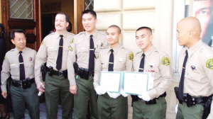 中新網(wǎng)9月20日電 據(jù)美國《僑報(bào)》報(bào)道,18日,在美國帕沙迪納市立劇場(chǎng)舉行的第378屆洛縣警局警察培訓(xùn)學(xué)校畢業(yè)典禮上,有4位亞裔警員現(xiàn)身在70名畢業(yè)生的行列當(dāng)中,其中包括兩名華裔,他們分別是圣蓋博居民何青源和柔似密居民陳得光。