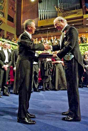 頒獎當(dāng)天共有8人上臺領(lǐng)獎,高錕被安排在第一個。瑞典國王卡爾十六世—古斯塔夫破格走向高錕站立處為他頒獎,彼此親切握手致意。高錕從容自若,滿臉笑容從瑞典國王手中接過諾貝爾物理獎狀,場面相當(dāng)溫馨。