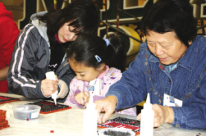 副會長鹿強當天全家上陣,包括岳父岳母和妻子兒女在內的一家六口全都來到了粘花現場,一起為世博會花車中國館模型粘貼由紅豆和黑豆組成的吉祥圖案,岳父方先生一邊干活一邊表示,能為世博會花車出一份力,這是他們全家的自豪。