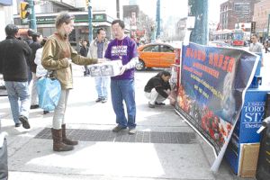 由多倫多華人團體聯合會副主席王清官、楊學武及黃政等,24日中午偕同一班義工,在中區華埠拉起“愛心多倫多,真情系玉樹”的橫額,為青海玉樹的7.1地震災民展開街頭募捐活動。在熙來攘往,人潮如鯽的士巴丹拿與登打士西街街角,一眾義工忙于呼吁路人踴躍捐助。當中,除了路過的華人樂于捐助外,不少主流人士,在了解募捐目的后,亦紛紛解囊相助,益見人間真愛,無分國界地域。