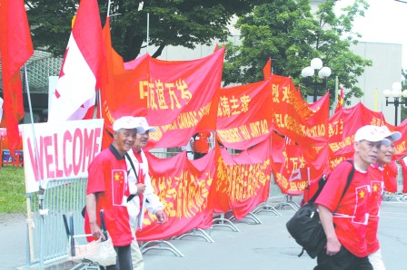 除了渥太華本地的華人團體和學生外,多倫多大學中國學生學者聯誼會(UTCSSA),多倫多中國大學生聯合會(CUAUT)以及多倫多地區國家公派學生訪問學者聯誼會等多個大多地區的學生團體也組織了歡迎團,專程趕赴渥太華胡錦濤下榻的酒店舉行盛大的歡迎儀式。他們手持自備中國國旗和橫幅,在酒店前沿路排成一條秩序井然的歡迎隊伍。