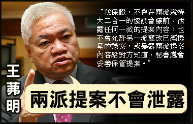 中新網(wǎng)9月9日電 據(jù)馬來(lái)西亞《星洲日?qǐng)?bào)》報(bào)道,馬華總秘書王茀明8日說(shuō),他保證不會(huì)在兩派就特大二合一的協(xié)調(diào)會(huì)議前,泄露任何一派的提案內(nèi)容,甚至允許另一派竄改已經(jīng)提呈的議案,或暴露兩派提案內(nèi)容給對(duì)方知道。
