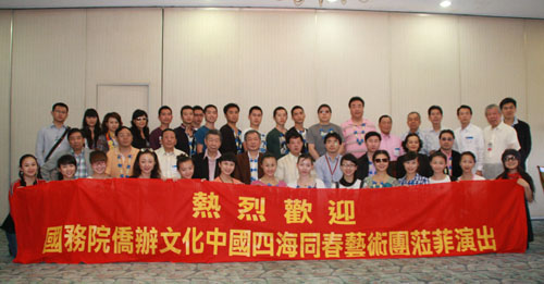 當天晚上,中國駐菲律賓大使館和菲華各界聯合會舉辦盛大的聯歡晚宴,歡迎藝術團的到來。菲華各界聯合會主席戴宏達、中國駐菲律賓大使劉建超、藝術團團長熊昌良分別發表熱情洋溢的致辭。在致辭中,戴宏達主席和劉建超大使對國務院僑辦組派如此高水準的藝術團來菲演出表示感謝,各位藝術家放棄在春節與家人團聚的機會,千里迢迢赴海外慰問僑胞,用歡快的歌聲和舞蹈為海外僑社增添了喜慶的春節氣氛。全體旅菲僑胞將翹首期盼藝術團的演出取得圓滿成功。