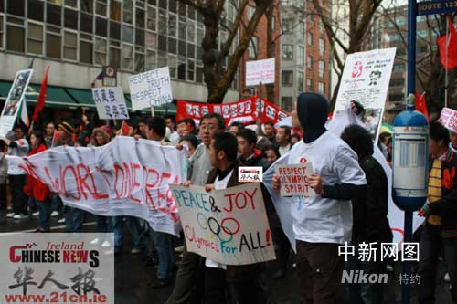 游行隊伍中最搶眼,人氣也最旺的是一位白發蒼蒼的愛爾蘭大叔!只見他頭戴繡有奧運吉祥物的鴨舌帽,身披奧運五環旗,手持中國小國旗。記者與這位名叫Vincent Lavery的老人交談后,得知他是一名旅居美國的愛爾蘭人,曾于上世紀80年代去過中國。從那時起,他就開始關注中國的情況。在對中國的飛速發展感到吃驚的同時,也對中國引領世界經濟潮流寄予厚望。當談到“藏獨”問題和北京奧運時,他說:“我們今天以和平的方式來表達我們的真心,而‘藏獨’分子卻以肆意打砸搶燒來換取憐憫!天底下居然有如此猖狂的暴徒!究其原因,還是受人指使,蠱惑人心,破壞奧運!奧林匹克精神是屬于全世界人民的!是不容被玷污的!”親切的面容,真摯的理解,帶給在場華人無盡的感動!