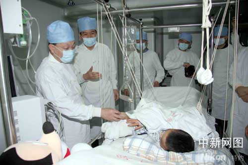 中新網(wǎng)廣州七月二日電 (記者 郭軍)中國國務(wù)院僑辦副主任馬儒沛今天來到廣州暨南大學(xué),看望正在這里接受治療的四川地震災(zāi)區(qū)重傷員——岳強(qiáng)。他同時(shí)勉勵(lì)暨南大學(xué)華僑醫(yī)院醫(yī)護(hù)人員繼續(xù)發(fā)揮抗震救災(zāi)的精神,努力將地震傷員救治好。