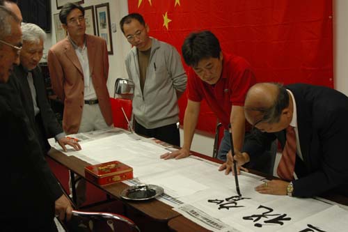 神七發射成功慶祝會上,美國福州竹歧同鄉會秘書長鄭時浩即興揮毫。