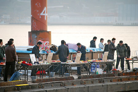 2月2日上午,中國船員家屬來到長崎漁港,登上停靠在那里的第一山田丸,依次擺放好6名中國船員的彩色遺照。按照中國舟山的習俗,每幅遺照前面點燃起兩根蠟燭和3個焚香,擺放好兩束鮮花和從國內帶來的紹興花雕酒以及親人日常喜歡吃的水果、糕點……當他們最后把一杯一杯的紹興花雕酒灑向大海的時候,當他們悲痛的哭喊聲在甲板上空回蕩的時候,所有在場的人都潸然淚下。