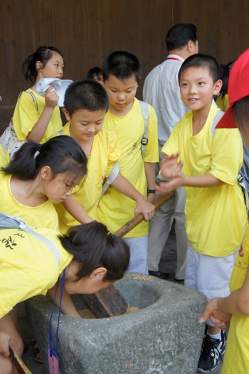 營員們乘坐大巴,途徑剛剛開通的諸永高速,到達目的地永嘉埭頭古村。在村里,他們不僅欣賞到了渾然天成的文房四寶風景,了解了非物質文化遺產的“松風水月”古建筑風格,親身感受“棟梁”一詞的深厚含義和古代生活中的尊師之舉,也跟著村里的老人,體驗到了地道的農家生活。編草鞋、搓稻繩、磨豆腐、搗米、拔花生、捉田魚,各種各樣的農家活動讓孩子們在親近原生態自然的同時,學到了許多生活的智慧。
