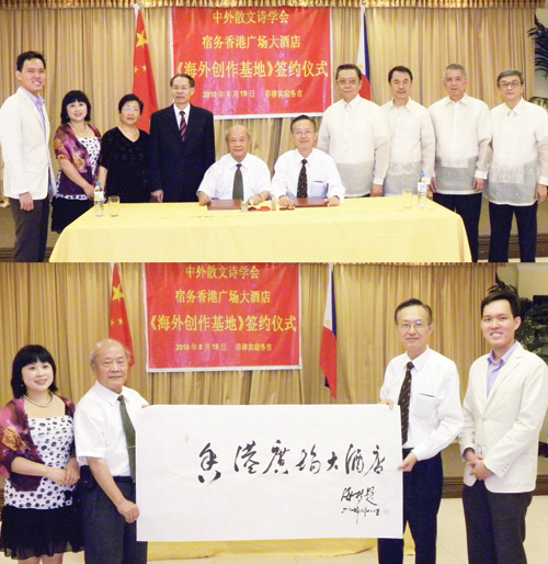 在何時敬和宿霧華社人士的共同見證下,中外散文詩學會與菲律賓宿霧香港廣場大酒店于19日晚,簽署了創設“中外散文詩學會海外創作基地”的協議。