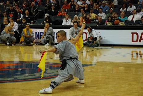 中新網11月30日電 據國家漢辦網站消息,美國當地時間11月26日晚,美國北卡羅來納州夏洛特市中心著名的時代華納NBA賽場上演了NBA常規賽,由夏洛特山貓隊主場迎戰遠道而來的休斯敦火箭隊。該賽場可容納20200名觀眾,當晚上座率超過8成。來自費佛爾大學孔子學院的4位功夫大師在中場休息時為現場觀眾獻上了時長6分45秒的中國功夫表演,將本來已經很高昂地賽場氣氛推向了一個新的高潮。