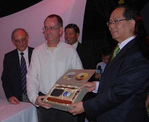 在慶祝晚會上,邱大使和熱拉爾多校長共同為《把目光投向中國》的攝影圖片展剪彩。