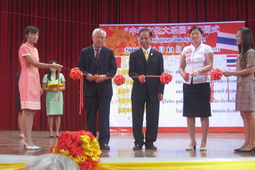 中新網10月14日電 據華僑大學華文學院報道,13日下午,由中國海外交流協會、泰國華文教師公會、華僑大學華文學院共同主辦,中國華語培訓中心、泰國坤敬公立華僑學校承辦的“中華文化大樂園”坤敬分營開園式在坤敬公立華僑學校禮堂隆重舉行。