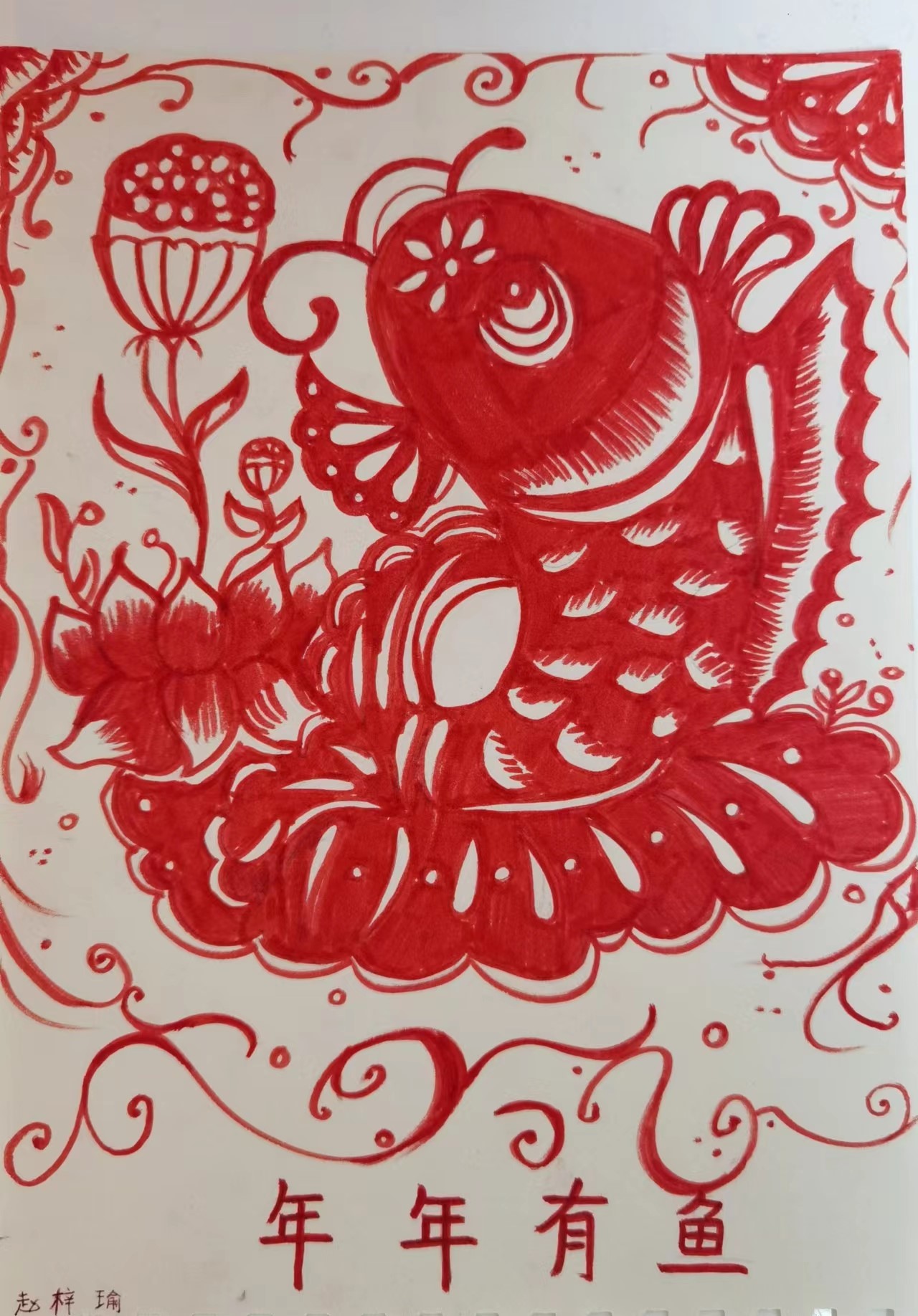媽媽每年過年時都會在窗戶上貼上不同的剪紙窗花。在今年春節時,我就畫了一幅剪紙風格的年畫,這樣我們就可以一直把它掛在墻上,年年有余。