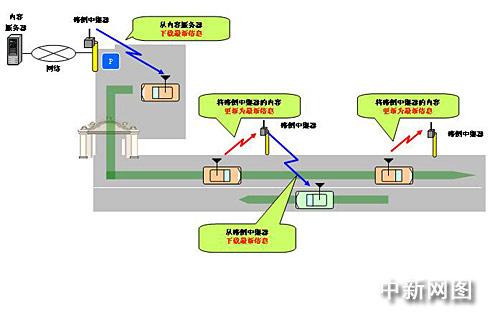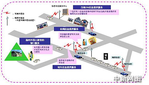 本系統考慮了信息通信基礎設施不十分完備的旅游觀光地的地域特性,在無線基站沒有聯網的情況下,也能靈活運用以車輛間通信技術為基礎的“車輛傳輸信息,以及車輛間直接構成網絡”功能,提供:①當地TPO信息提供服務;②傳聞信息提供服務;③堵車信息提供服務;④面向外國人旅游觀光客的向導服務等與旅游司機需求相匹配的信息。