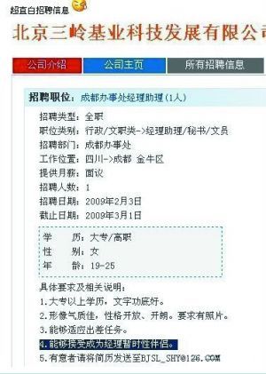 2月4日上午10時(shí)許,《史上最牛招聘啟事,可是正規(guī)發(fā)布的哦!》這個(gè)帖子在天涯社區(qū)迅速引起關(guān)注。發(fā)帖者網(wǎng)友“木鼠”稱在成都招聘網(wǎng)上發(fā)現(xiàn)一條招聘經(jīng)理助理的啟事,其中竟有“能夠接受成為經(jīng)理暫時(shí)性伴侶”這樣的字眼。