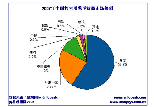 百度的市場(chǎng)份額已由2007年的59.3%上升到2008年前3季度的62.9%。谷歌中國(guó)的市場(chǎng)份額已由2007年的23.4%上升到2008年前3季度的26.9%。二者在搜索引擎市場(chǎng)中的份額由上年的82.7%擴(kuò)大到今年的89.8%,上升了7個(gè)百分點(diǎn)。