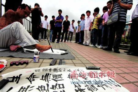 富士康先后發(fā)生“九連跳”,正當(dāng)社會(huì)學(xué)家以及各界紛紛出來(lái)指出富士康公司種種問(wèn)題時(shí),昨日,有腳書(shū)絕技的殘疾人郭乙傳,到富士康大門外天橋上寫(xiě)勵(lì)志語(yǔ)“盡孝應(yīng)先,和諧靠己”。中午一小時(shí)內(nèi),郭乙傳贈(zèng)送出5幅字幅。