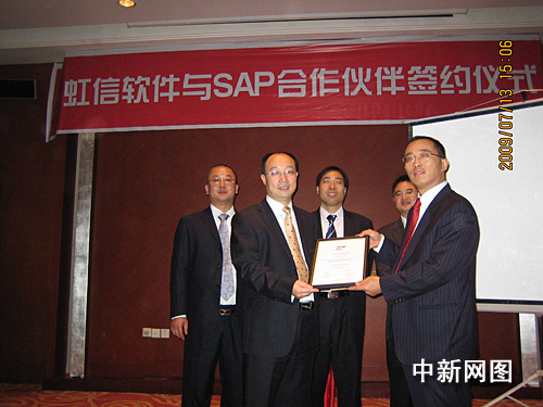 據悉,作為SAP在中國非常重要的信息化合作伙伴之一,虹信軟件將與SAP聯手協作為更多的客戶提供更加優質的服務。這一將跨國公司的領先技術、先進管理理念與本土公司的資源、經驗有機結合起來的強強合作,被業界看成是未來中國信息服務業發展的新方向。SAP中國區副總裁唐杰攜虹信軟件董事長莫文偉、總經理任宗貴、副總經理劉嘉陵共同出席了本次簽約授牌儀式。