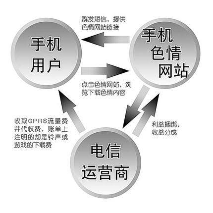 “簡單來說,一條手機(jī)色情信息內(nèi)容的發(fā)布,一般要經(jīng)過三個(gè)環(huán)節(jié):運(yùn)營商(主要是指各種手機(jī)圖片、鈴聲、視頻、文字、游戲等內(nèi)容發(fā)布平臺和渠道的提供者)、SP和WAP網(wǎng)站。”北京郵電大學(xué)一個(gè)曾長期關(guān)注移動增值業(yè)務(wù)的人透露,“SP在運(yùn)營商和WAP網(wǎng)站間牽線搭橋,三者已形成捆綁各方的利益鏈,一旦獲利,三方都有收益。”