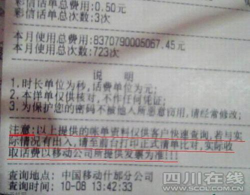 針對打印話單出錯的現象,中國移動客服人員表示自助打印話單機提供的話費清單僅提供用戶的通話、短信、上網等業務的消費情況供用戶參考,最終的話費應以在營業柜臺打印的話費單為準。