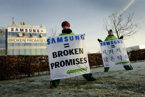 3月3日,國際環保組織綠色和平在韓國電子巨頭三星比利時總部門前展開巨大的橫幅“三星=失信”,以抗議三星沒能按照自己先前的承諾去除其產品中的有毒有害物質。