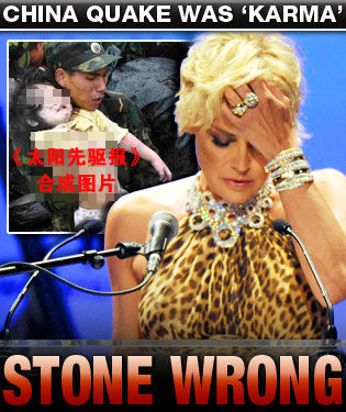 莎朗斯通那些違反人類道德的言論,遭遇全民譴責。西安的一些音像店昨日已將與她有關的作品下架,其網絡下載電影也遭到網友抵制。記者還發(fā)現(xiàn),在一些美國網站上,美國網友也展開了對她的批判。