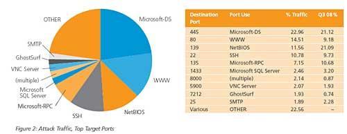 攻擊針對20800個獨立端口,相當于第三季度的8倍多。其中,針對445端口(Microsoft-DS)的攻擊最多,約占來自美國和俄羅斯的25%