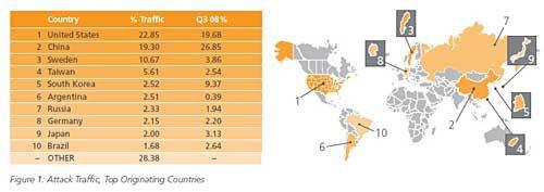 據國外媒體報道,2008年第四季度,美國首次成為全球最大的黑客攻擊源,中國和瑞典分列二、三位。中國臺灣和韓國也位列前十。