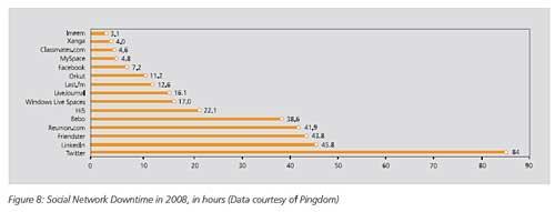 Twitter去年宕機(jī)時間至少是其競爭對手的2倍,其2008年的總宕機(jī)時間為84小時,排名首位。