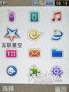 在界面方面,該機延續三星傳統風格,12宮格的主菜單平鋪出主要功能,待機桌面可以顯示或關閉鐘表和日歷,五維導航鍵支持快捷操作。