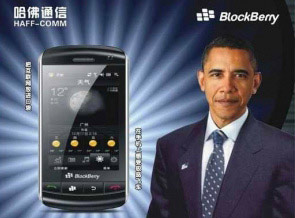 據美國媒體報道,日前,美國總統巴拉克奧巴馬的形象出現在中國一款仿黑莓BlackBerry Storm 9500手機的宣傳海報上。
